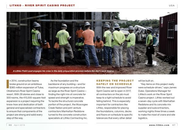 KEEPING THE PROJECT SAFELY ON SCHEDULE With the new and improved River Spirit Casino set to open in 2017 , all contractors on the job must keep to a tight schedule to avoid falling behind . This is especially important for contractors like Lithko , responsible for placing the foundations , columns , decks and floors on schedule to specific tolerances that every other detail will be built on . “ Key items on this project really were schedule-driven ,” says James Duke , Operations Manager for Lithko ’ s work on the River Spirit Casino project . Lithko worked out a seven-day cycle with Manhattan Redstone and its concrete mix supplier and subcontractors , working nights three times a week to make the most of crane and site logistics . www . lithko . com 97