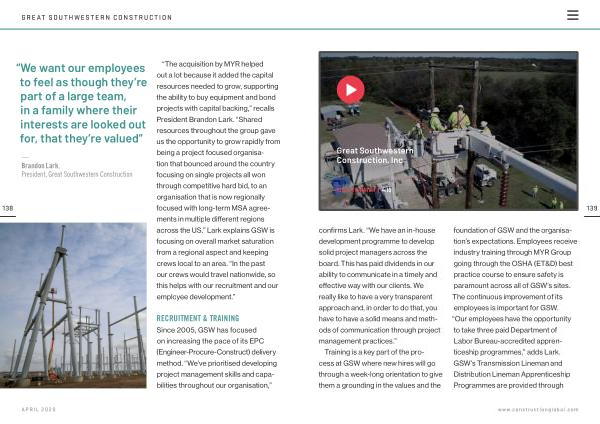 “ The acquisition by MYR helped out a lot because it added the capital resources needed to grow , supporting the ability to buy equipment and bond projects with capital backing ,” recalls President Brandon Lark . “ Shared resources throughout the group gave us the opportunity to grow rapidly from being a project focused organisation that bounced around the country focusing on single projects all won through competitive hard bid , to an organisation that is now regionally focused with long-term MSA agreements in multiple different regions across the US .” Lark explains GSW is focusing on overall market saturation from a regional aspect and keeping crews local to an area . “ In the past our crews would travel nationwide , so this helps with our recruitment and our employee development .”