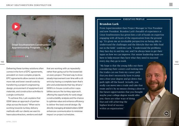 From Superintendent then Project Manager to Vice President and now President , Brandon Lark ’ s breadth of experience at Great Southwestern has given him a raft of hands on expertise engaging with all facets of the organisation from the ground up . “ It ’ s given me an invaluable perspective on being able to understand the challenges and the lifestyle that our folks lead out in the field ,” confirms Lark . “ I understand the problems they face day in and day out , and I ’ m always keen to get their input on how we can improve . Our senior leadership team are here to help ensure they have what they need to succeed every day they go to work .