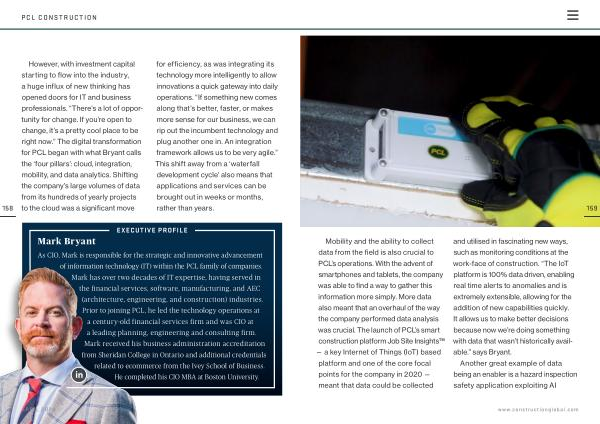 However , with investment capital starting to flow into the industry , a huge influx of new thinking has opened doors for IT and business professionals . “ There ’ s a lot of opportunity for change . If you ’ re open to change , it ’ s a pretty cool place to be right now .” The digital transformation for PCL began with what Bryant calls the ‘ four pillars ’: cloud , integration , mobility , and data analytics . Shifting the company ’ s large volumes of data from its hundreds of yearly projects to the cloud was a significant move for efficiency , as was integrating its technology more intelligently to allow innovations a quick gateway into daily operations . “ If something new comes along that ’ s better , faster , or makes more sense for our business , we can rip out the incumbent technology and plug another one in . An integration framework allows us to be very agile .” This shift away from a ‘ waterfall development cycle ’ also means that applications and services can be brought out in weeks or months , rather than years .
