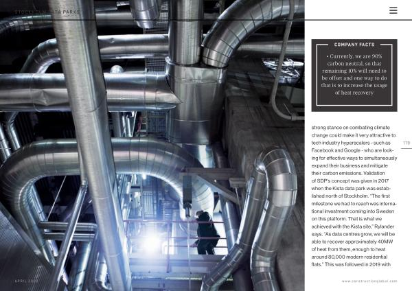 strong stance on combating climate change could make it very attractive to tech industry hyperscalers - such as Facebook and Google - who are looking for effective ways to simultaneously expand their business and mitigate their carbon emissions . Validation of SDP ’ s concept was given in 2017 when the Kista data park was established north of Stockholm . “ The first milestone we had to reach was international investment coming into Sweden on this platform . That is what we achieved with the Kista site ,” Rylander says . “ As data centres grow , we will be able to recover approximately 40MW of heat from them , enough to heat around 80,000 modern residential flats .” This was followed in 2019 with