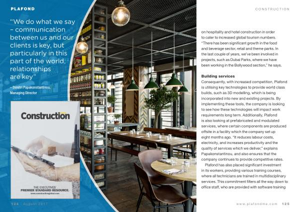 Building services Consequently , with increased competition , Plafond is utilising key technologies to provide world class builds , such as 3D modelling , which is being incorporated into new and existing projects . By implementing these tools , the company is looking to see how these technologies will impact work requirements long term . Additionally , Plafond is also looking at prefabricated and modulated services , where certain components are produced offsite in a facility which the company set up eight months ago . “ It reduces labour costs , electricity , and increases productivity and the quality of services which we deliver ,” explains Papakonstantinou , and also ensures that the company continues to provide competitive rates .