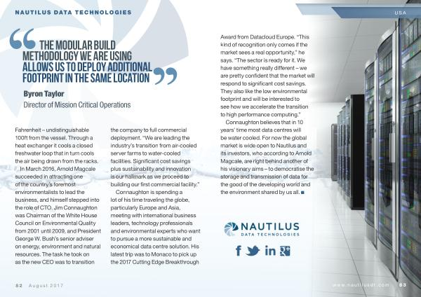 Connaughton believes that in 10 years ’ time most data centres will be water cooled . For now the global market is wide open to Nautilus and its investors , who according to Arnold Magcale , are right behind another of his visionary aims – to democratise the storage and transmission of data for the good of the developing world and the environment shared by us all .
