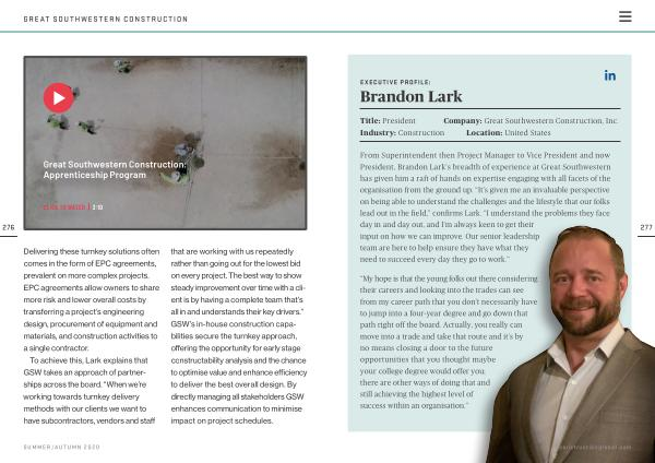From Superintendent then Project Manager to Vice President and now President , Brandon Lark ’ s breadth of experience at Great Southwestern has given him a raft of hands on expertise engaging with all facets of the organisation from the ground up . “ It ’ s given me an invaluable perspective on being able to understand the challenges and the lifestyle that our folks lead out in the field ,” confirms Lark . “ I understand the problems they face day in and day out , and I ’ m always keen to get their input on how we can improve . Our senior leadership team are here to help ensure they have what they need to succeed every day they go to work .”