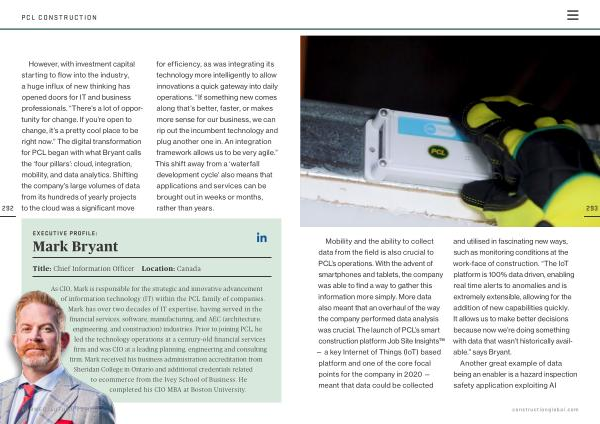 However , with investment capital starting to flow into the industry , a huge influx of new thinking has opened doors for IT and business professionals . “ There ’ s a lot of opportunity for change . If you ’ re open to change , it ’ s a pretty cool place to be right now .” The digital transformation for PCL began with what Bryant calls the ‘ four pillars ’: cloud , integration , mobility , and data analytics . Shifting the company ’ s large volumes of data from its hundreds of yearly projects to the cloud was a significant move for efficiency , as was integrating its technology more intelligently to allow innovations a quick gateway into daily operations . “ If something new comes along that ’ s better , faster , or makes more sense for our business , we can rip out the incumbent technology and plug another one in . An integration framework allows us to be very agile .” This shift away from a ‘ waterfall development cycle ’ also means that applications and services can be brought out in weeks or months , rather than years .