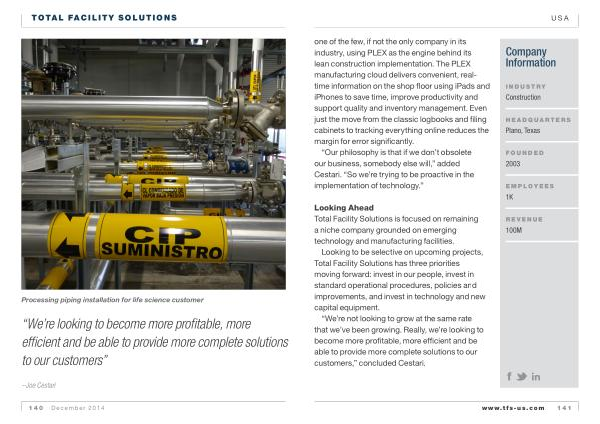 Looking Ahead Total Facility Solutions is focused on remaining a niche company grounded on emerging technology and manufacturing facilities .