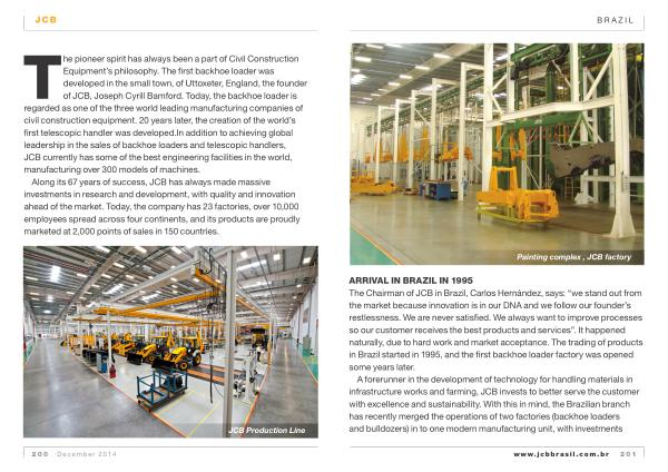 The pioneer spirit has always been a part of Civil Construction Equipment ’ s philosophy . The first backhoe loader was developed in the small town , of Uttoxeter , England , the founder of JCB , Joseph Cyrill Bamford . Today , the backhoe loader is regarded as one of the three world leading manufacturing companies of civil construction equipment . 20 years later , the creation of the world ’ s first telescopic handler was developed . In addition to achieving global leadership in the sales of backhoe loaders and telescopic handlers , JCB currently has some of the best engineering facilities in the world , manufacturing over 300 models of machines .