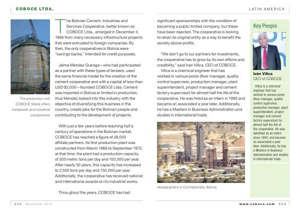 With just a few years before reaching half a century of operations in the Bolivian market , COBOCE has reached a figure of 28,000 affiliate partners . Its first production plant was constructed from March 1969 to September 1972 ; at that time , the plant had a production capacity of 300 metric tons per day and 100,000 per year . After nearly 50 years , this capacity has increased to 2,500 tons per day and 750,000 per year . Additionally , the cooperative has received national and international awards on its industrial works .