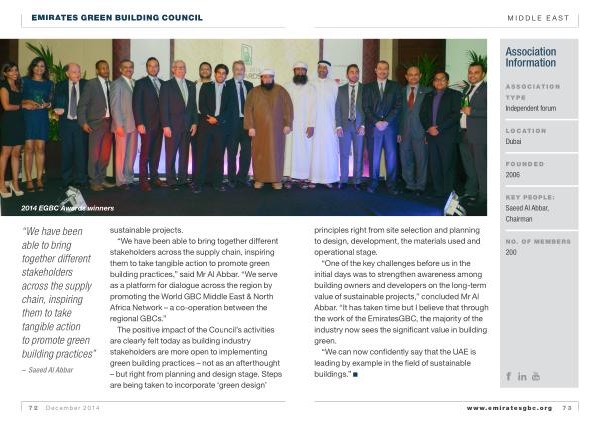“ We can now confidently say that the UAE is leading by example in the field of sustainable buildings .” www . emiratesgbc . org 73