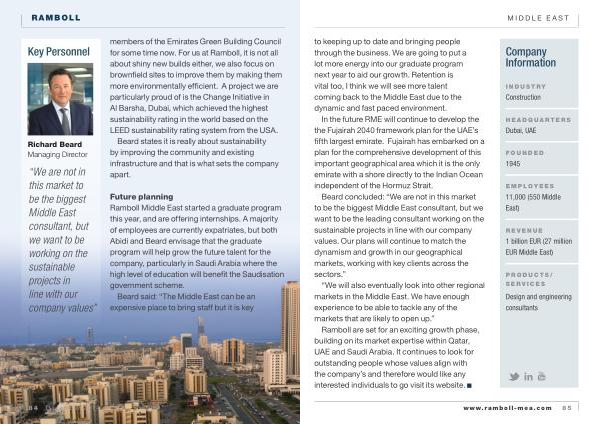 Future planning Ramboll Middle East started a graduate program this year , and are offering internships . A majority of employees are currently expatriates , but both Abidi and Beard envisage that the graduate program will help grow the future talent for the company , particularly in Saudi Arabia where the high level of education will benefit the Saudisation government scheme .