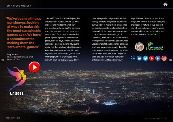 In 2028 , from 21 July to 6 August , LA will play host to the Olympic Games . Walters and his team have been working towards making the games a zero-carbon event , as well as to raise awareness of the city ’ s sustainability goals . Speaking on the ambitions in place , Walters says , “ We ’ ve been rolling up our sleeves , looking at ways to make this the most sustainable games ever . We have a commitment to making them the ‘ zero-waste ’ games . The Olympic planners are directly working with all of our big sponsors . They FEBRUARY 2020