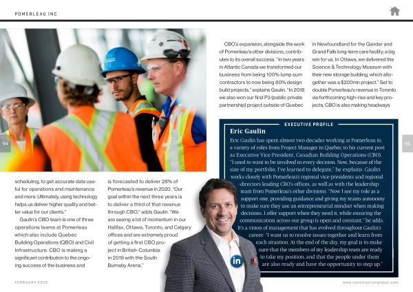Eric Gaulin has spent almost two decades working at Pomerleau in a variety of roles from Project Manager in Quebec to his current post as Executive Vice President , Canadian Building Operations ( CBO ). “ I used to want to be involved in every decision . Now , because of the size of my portfolio , I ’ ve learned to delegate ,” he explains . Gaulin works closely with Pomerleau ’ s regional vice-presidents and regional -directors leading CBO ’ s offices , as well as with the leadership team from Pomerleau ’ s other divisions . “ Now I see my role as a support one , providing guidance and giving my teams autonomy to make sure they use an entrepreneurial mindset when making decisions . I offer support when they need it , while ensuring the communication across our group is open and constant ,” he adds . It ’ s a vision of management that has evolved throughout Gaulin ’ s career : “ I want us to resolve issues together and learn from each situation . At the end of the day , my goal is to make sure that the members of my leadership team are ready to take my position , and that the people under them are also ready and have the opportunity to step up .”