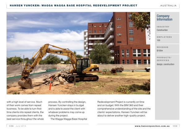 with a high level of service . Much of their work comes from repeat business . To be able to turn firsttime clients into repeat clients , the company provides them with the best service throughout the whole process . By controlling the design , Hansen Yuncken stays in budget and is able to assist the client with whatever problems may come up during the project .