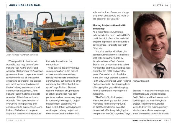 “ I do believe it is a very unique value proposition in the market – there are railway operators , railway maintainers and railway constructors , but there is no other company that offers that full life cycle ,” says Richard Stewart , General Manager of Operations at John Holland Rail . “ We selfperform , and we have a very large in house engineering and project management capability . We have 2,500 John Holland people working on railway projects at the moment and another 4,000