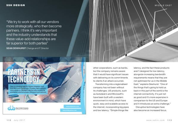 Transforming into a regionalised company has not been without its challenges . US products , such as Autodesk ’ s and Microsoft ’ s have been built with a western environment in mind , which have quick , easy and scalable access to the internet , incorporating big pipes and low latency . “ Simple things like latency , and the fact these products aren ’ t designed for low latency , alongside increasing bandwidth requirements means that they are not optimised for us in the Middle East ,” explains Dewhurst . “ One of the things that ’ s going to hold us back in this part of the world is the internet connectivity . It ’ s just not as good and it ’ s more expensive in comparison to the US and Europe and it introduces an extra challenge .”