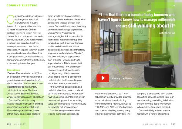 Corbins Electric ’ s industry leading virtual construction , building information modelling ( BIM ), and 3D modelling capabilities , is one of that many advantages that sets them apart from the competition . Although these are facets of electrical contracting that are already techheavy , Corbins is keen to continuously develop its technology capabilities . Using eVolve™ workflow to leverage single-click automation for fabrication , material ordering , and detailed as-built drawings , Corbins is able to deliver efficient virtual construction services to contractors , engineers , and architects . We don ’ t just do modelling to support our own projects – we also do this to support others . This is a need that our industry has – not everybody can accelerate that functionality quickly enough . We have some unique tools that help contractors prefabricate - that ’ s something we are able to leverage worldwide .”