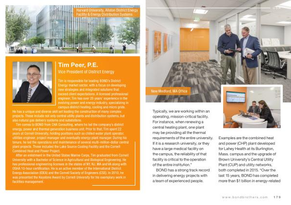 Tim is responsible for leading BOND ’ s District Energy market sector , with a focus on developing new strategies and integrated solutions that exceed client expectations . A licensed professional engineer , Tim has over 25 years ’ experience in the evolving power and energy industry , specializing in campus district heating , cooling and micro grids . He has a unique and diverse skill set leading the construction of many complex projects . These include not only central utility plants and distribution systems , but also natural gas delivery systems and substations .