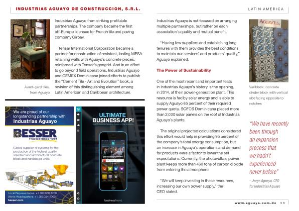 Tensar International Corporation became a partner for construction of resistant , lasting MESA retaining walls with Aguayo ’ s concrete pieces , reinforced with Tensar ’ s geogrid . And in an effort to go beyond field operations , Industrias Aguayo and CEMEX Dominicana joined efforts to publish the “ Cement Tile - Art and Evolution ” book , a revision of this distinguishing element among Latin American and Caribbean architecture .