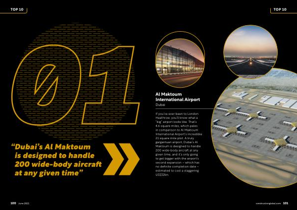 If you ’ ve ever been to London Heathrow , you ’ ll know what a “ big ” airport looks like . That ’ s 4.6 square miles , which pales in comparison to Al Maktoum International Airport ’ s incredible 21 square mile plot . A truly gargantuan airport , Dubai ’ s Al Maktoum is designed to handle 200 wide-body aircraft at any given time , and it ’ s only going to get bigger with the airport ’ s second expansion – which has no definite completion date – estimated to cost a staggering US $ 32bn . constructionglobal . com 101