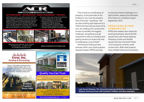 REBUILDING WITHIN COMMUNITIES KPRS also realizes new visions for existing landmarks , like its 92,000 square foot Lake Forest Gateway Shopping Center and 59,908 square foot San Clemente Phase I and II projects currently under construction . Both retail projects have entailed extensive renovations