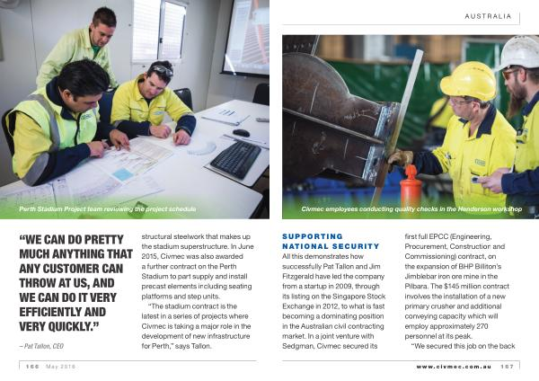 SUPPORTING NATIONAL SECURITY All this demonstrates how successfully Pat Tallon and Jim Fitzgerald have led the company from a startup in 2009 , through its listing on the Singapore Stock Exchange in 2012 , to what is fast becoming a dominating position in the Australian civil contracting market . In a joint venture with Sedgman , Civmec secured its first full EPCC ( Engineering , Procurement , Construction and Commissioning ) contract , on the expansion of BHP Billiton ’ s Jimblebar iron ore mine in the Pilbara . The $ 145 million contract involves the installation of a new primary crusher and additional conveying capacity which will employ approximately 270 personnel at its peak . “ We secured this job on the back