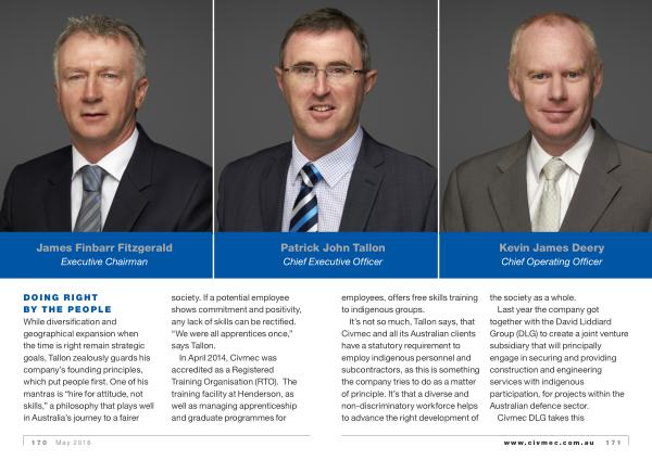 It ’ s not so much , Tallon says , that Civmec and all its Australian clients have a statutory requirement to employ indigenous personnel and subcontractors , as this is something the company tries to do as a matter of principle . It ’ s that a diverse and non-discriminatory workforce helps to advance the right development of the society as a whole . Last year the company got together with the David Liddiard Group ( DLG ) to create a joint venture subsidiary that will principally engage in securing and providing construction and engineering services with indigenous participation , for projects within the Australian defence sector . Civmec DLG takes this