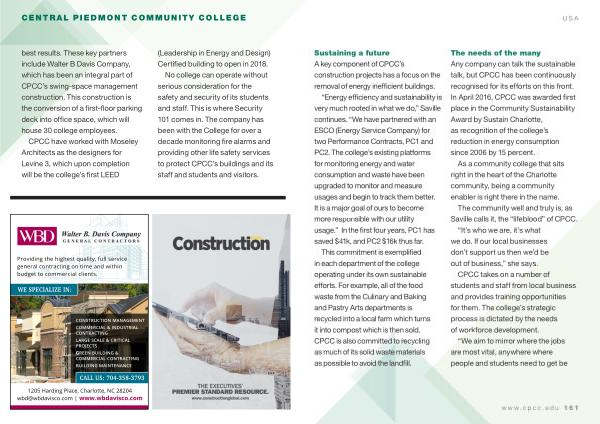 best results . These key partners include Walter B Davis Company , which has been an integral part of CPCC ’ s swing-space management construction . This construction is the conversion of a first-floor parking deck into office space , which will house 30 college employees .
