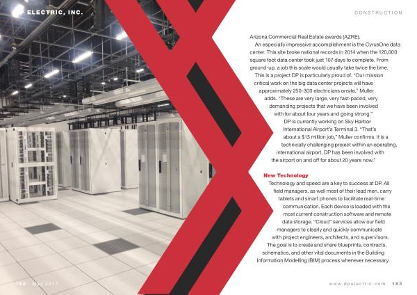 An especially impressive accomplishment is the CyrusOne data center . This site broke national records in 2014 when the 120,000 square foot data center took just 107 days to complete . From ground-up , a job this scale would usually take twice the time . This is a project DP is particularly proud of . “ Our mission critical work on the big data center projects will have approximately 250-300 electricians onsite ,” Muller adds . “ These are very large , very fast-paced , very demanding projects that we have been involved with for about four years and going strong .” DP is currently working on Sky Harbor International Airport ’ s Terminal 3 . “ That ’ s about a $ 13 million job ,” Muller confirms . It is a technically challenging project within an operating , international airport . DP has been involved with the airport on and off for about 20 years now .”