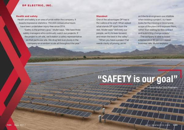 Health and safety Health and safety is an area of pride within the company . It boasts impressive statistics : 750,000 consecutive hours have been undertaken injury-free since 2014 . “ Safety is the primary goal ,” Muller says . “ We have three safety managers who continually watch our projects . If the project is off-site , we ’ ll station a safety representative on that particular site . We drug test everybody in the company on a random scale all throughout the year .”