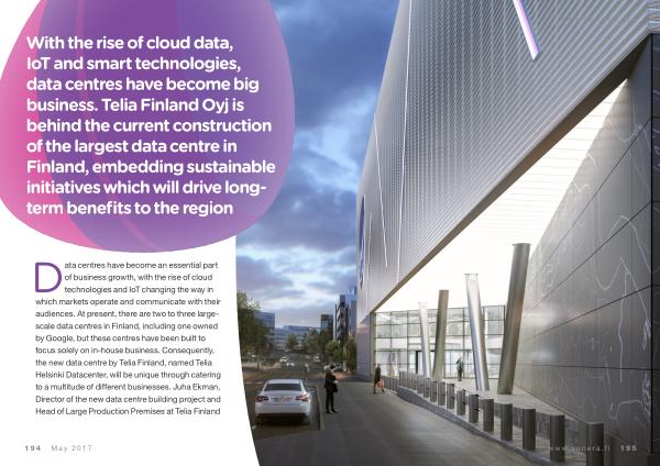 With the rise of cloud data , IoT and smart technologies , data centres have become big business . Telia Finland Oyj is behind the current construction of the largest data centre in Finland , embedding sustainable initiatives which will drive longterm benefits to the region