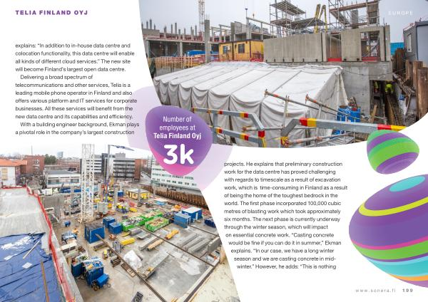 EUROPE projects . He explains that preliminary construction work for the data centre has proved challenging with regards to timescale as a result of excavation work , which is time-consuming in Finland as a result of being the home of the toughest bedrock in the world . The first phase incorporated 100,000 cubic metres of blasting work which took approximately six months . The next phase is currently underway through the winter season , which will impact on essential concrete work . “ Casting concrete would be fine if you can do it in summer ,” Ekman explains . “ In our case , we have a long winter season and we are casting concrete in midwinter .” However , he adds : “ This is nothing www . sonera . fi 199