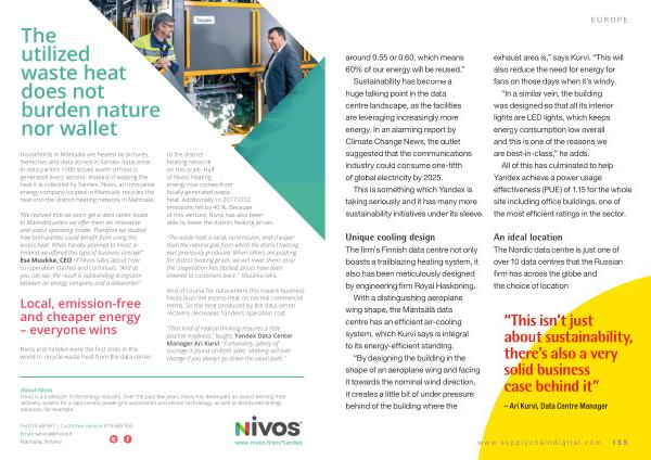 to the district heating network on this scale . Half of Nivos ’ heating energy now comes from locally generated waste heat . Additionally , in 2017 CO2 emissions fell by 40 %. Because of this venture , Nivos has also been able to lower the district heating prices .