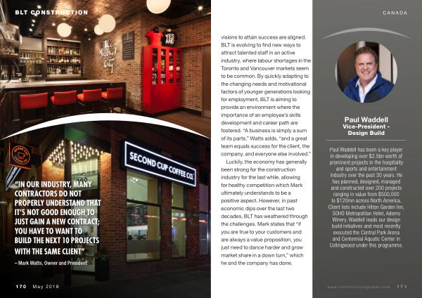 CANADA visions to attain success are aligned . BLT is evolving to find new ways to attract talented staff in an active industry , where labour shortages in the Toronto and Vancouver markets seem to be common . By quickly adapting to the changing needs and motivational factors of younger generations looking for employment , BLT is aiming to provide an environment where the importance of an employee ’ s skills development and career path are fostered . “ A business is simply a sum of its parts ,” Watts adds , “ and a great team equals success for the client , the company , and everyone else involved .”