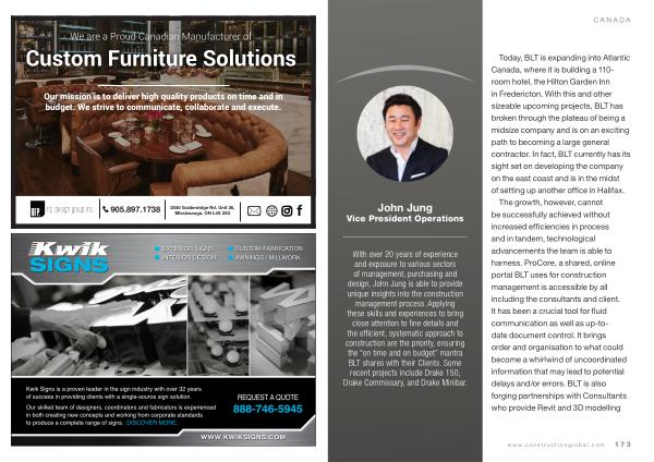 Today , BLT is expanding into Atlantic Canada , where it is building a 110- room hotel , the Hilton Garden Inn in Fredericton . With this and other sizeable upcoming projects , BLT has broken through the plateau of being a midsize company and is on an exciting path to becoming a large general contractor . In fact , BLT currently has its sight set on developing the company on the east coast and is in the midst of setting up another office in Halifax .