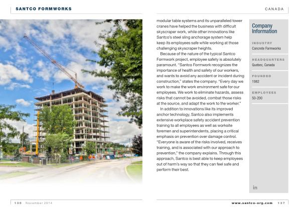 Because of the nature of the typical Santco Formwork project , employee safety is absolutely paramount . “ Santco Formwork recognizes the importance of health and safety of our workers , and wants to avoid any accident or incident during construction ,” states the company . “ Every day we work to make the work environment safe for our employees . We work to eliminate hazards , assess risks that cannot be avoided , combat those risks at the source , and adapt the work to the worker .”