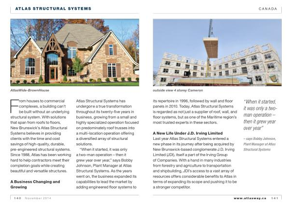 A New Life Under J . D . Irving Limited Last year Atlas Structural Systems entered a new phase in its journey after being acquired by New Brunswick-based conglomerate J . D . Irving Limited ( JDI ), itself a part of the Irving Group of Companies . With a hand in many industries from forestry and agriculture to transportation and shipbuilding , JDI ’ s access to a vast array of resources offers considerable benefits to Atlas in terms of expanding its scope and pushing it to be a stronger competitor .