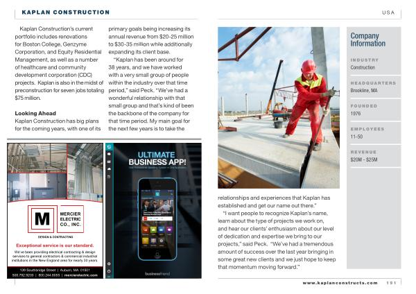 “ I want people to recognize Kaplan ’ s name , learn about the type of projects we work on , and hear our clients ’ enthusiasm about our level of dedication and expertise we bring to our projects ,” said Peck . “ We ’ ve had a tremendous amount of success over the last year bringing in some great new clients and we just hope to keep that momentum moving forward .” www . kaplanconstructs . com 191