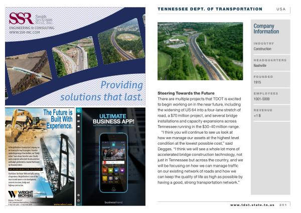 Steering Towards the Future There are multiple projects that TDOT is excited to begin working on in the near future , including the widening of US 64 into a four-lane stretch of road , a $ 70 million project , and several bridge installations and capacity expansions across Tennessee running in the $ 30-40 million range . “ I think you will continue to see us look at how we manage our assets at the highest level condition at the lowest possible cost ,” said Degges . “ I think we will see a whole lot more of accelerated bridge construction technology , not just in Tennessee but across the country , and we will be focusing on how we can manage traffic on our existing network of roads and how we can keep the quality of life as high as possible by having a good , strong transportation network .”