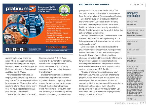 Since 1990 , the Buildcorp Group has expanded to include four business units , each with its own specialization , bringing diversity , knowledge and stability to their business model . Each division has the capacity to independently deliver projects within its area of specialization , while drawing on centralized group support systems and services , including quality , support and management frameworks . www . buildcorp . com . au 207
