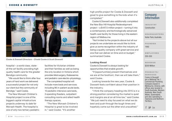 Cooke & Dowsett are a National Tier 1 Commercial Plumbing Company based in Melbourne , Victoria , with offices also located in South Australia , Western Australia , New South Wales , Queensland , and also operating in Tasmania and Northern Territory . www . cookedowsett . com . au 215