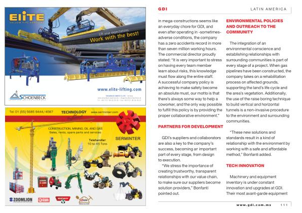 LATIN AMERICA in mega-constructions seems like an everyday chore for GDI , and even after operating in -sometimesadverse conditions , the company has a zero accidents record in more than seven million working hours . The commercial director proudly stated : “ It is very important to stress on having every team member learn about risks , this knowledge must flow along the entire staff . A successful company policy is achieving to make safety become an absolute must , our motto is that there ’ s always some way to help a coworker , and the only way possible to fulfill this policy is by providing the proper collaborative environment .”