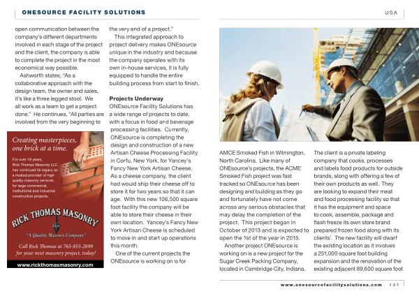 Projects Underway ONEsource Facility Solutions has a wide range of projects to date , with a focus in food and beverage processing facilities . Currently , ONEsource is completing the design and construction of a new Artisan Cheese Processing Facility in Corfu , New York , for Yancey ’ s Fancy New York Artisan Cheese . As a cheese company , the client had would ship their cheese off to store it for two years so that it can age . With this new 106,500 square foot facility the company will be able to store their cheese in their own location . Yancey ’ s Fancy New York Artisan Cheese is scheduled to move in and start up operations this month .