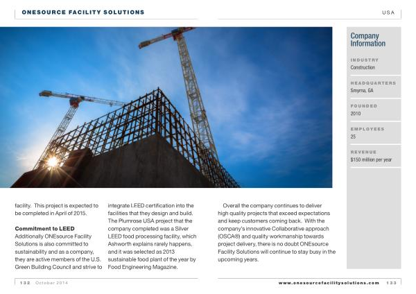 Commitment to LEED Additionally ONEsource Facility Solutions is also committed to sustainability and as a company , they are active members of the U . S . Green Building Council and strive to integrate LEED certification into the facilities that they design and build . The Plumrose USA project that the company completed was a Silver LEED food processing facility , which Ashworth explains rarely happens , and it was selected as 2013 sustainable food plant of the year by Food Engineering Magazine .