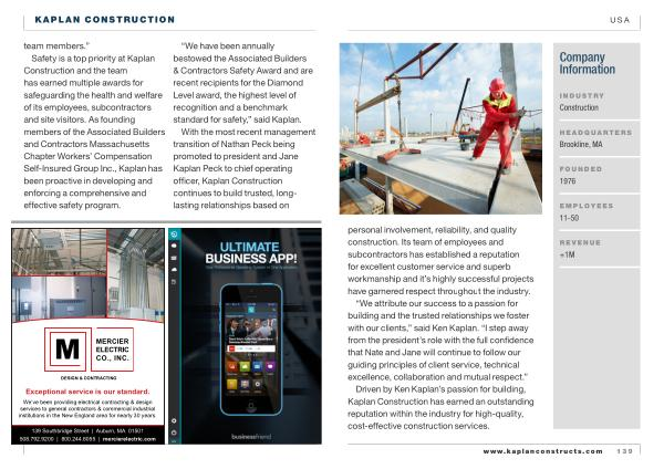 personal involvement , reliability , and quality construction . Its team of employees and subcontractors has established a reputation for excellent customer service and superb workmanship and it ’ s highly successful projects have garnered respect throughout the industry . “ We attribute our success to a passion for building and the trusted relationships we foster with our clients ,” said Ken Kaplan . “ I step away from the president ’ s role with the full confidence that Nate and Jane will continue to follow our guiding principles of client service , technical excellence , collaboration and mutual respect .”