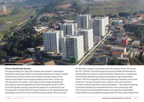 first Brazilian company to develop under the auspices of the “ My House , My Life ” (“ MCMV ” by its Portuguese acronym ) to obtain the Blue Seal of Sustainability from Brazil ’ s Caixa Econômica Federal bank , a certification that evaluates development projects according to rigid sustainability criteria . With this recognition , Precon Engineering ’ s reputation was further enhanced . This type of construction is based on the auto industry ’ s concept of vehicle assembly , as Miranda explains : “ We produce buildings in industrial factories and we assemble them at the construction site . This innovative and industrialized system has important sustainability characteristics as a foundation and generates 81 % less waste material than