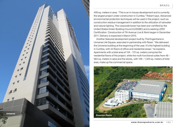 Another featured development project built by Thá Engenharia is Universe Life Square , executed in partnership with Rossi . “ We delivered the Universe building at the beginning of the year . It ’ s the highest building in Curitiba , with 44 floors of office and residential areas ,” he explains . Apartments with a total area of 104 - 172 sq . meters comprise the residential floors of the project , while the multi-functional suites from 46 – 584 sq . meters in area and the stores , with 139 – 1,325 sq . meters of total area , make up the commercial space .