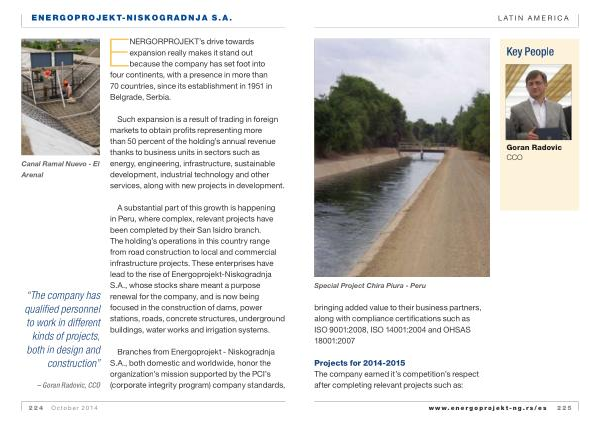 A substantial part of this growth is happening in Peru , where complex , relevant projects have been completed by their San Isidro branch . The holding ’ s operations in this country range from road construction to local and commercial infrastructure projects . These enterprises have lead to the rise of Energoprojekt-Niskogradnja S . A ., whose stocks share meant a purpose renewal for the company , and is now being focused in the construction of dams , power stations , roads , concrete structures , underground buildings , water works and irrigation systems .