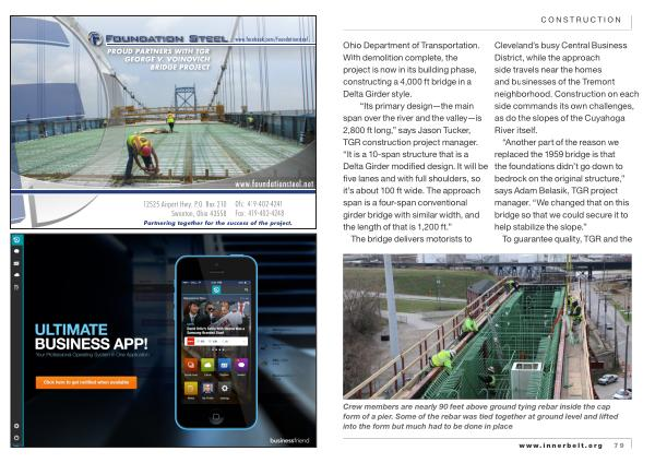 Crew members are nearly 90 feet above ground tying rebar inside the cap form of a pier . Some of the rebar was tied together at ground level and lifted into the form but much had to be done in place www . innerbelt . org 79