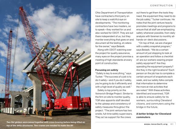 Safety is top priority on the Voinovich Bridge Project . Similar to the firm on site to monitor quality , TGR also appoints staff devoted to the upkeep and consistency of safety measures throughout the project . “ The joint venture has two onsite , full-time safety supervisors . They act as support for the crews out there to get them the tools they need , the equipment they need to do the job safely ,” Tucker continues . He notes that the joint venture heavily promotes meetings and programs to ensure that all staff are emphasizing safety whenever possible , from daily analysis with foremen to monthly allhands-on-deck discussions .