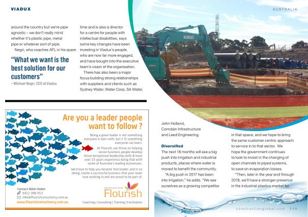 time and is also a director for a centre for people with intellectual disabilities , says some key changes have been investing in Viadux ’ s people , who are now far more engaged , and have bought into the executive team ’ s vision of the organisation . There has also been a major focus building strong relationships with suppliers and clients such as Sydney Water , Water Corp , SA Water ,